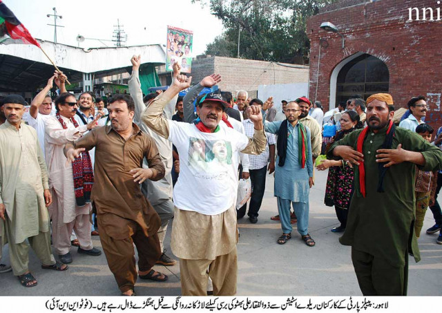 PPP workers at the railway station in Lahore. PHOTO: NNI