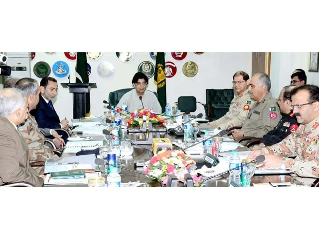 Interior Minister Chaudhry Nisar Ali Khan chairing the meeting of heads of civilian armed forces in Islamabad on Monday. PHOTO: PID