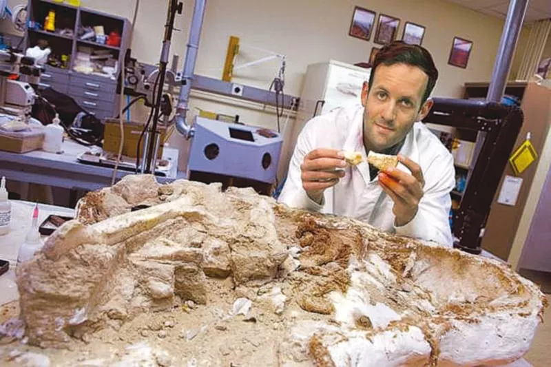 D’Emic pictured with a fossil of the meat-eating dinosaur Majungasaurus, dug up by Stony Brook University field crews. PHOTO: REUTERS