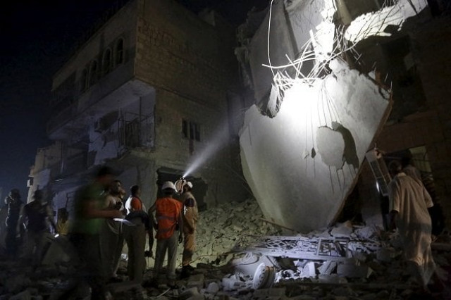 Civil defense members inspect a damaged building at a site hit by what activists said was a barrel bomb dropped by forces loyal to Syria's President Bashar al-Assad in Maaret al-Naaman town in Idlib province June 4, 2015. PHOTO: REUTERS