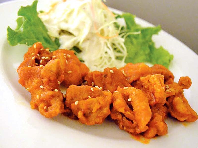 • Coat the chicken with corn flour and transfer it onto a large pan, drizzled with very little oil. Sauté the chicken at medium-heat for about four minutes, or until it becomes brown in colour.