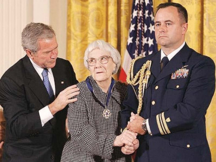 Former US President George W Bush (L) awards the Presidential Medal of Freedom to American novelist Harper Lee (C) of To Kill a Mockingbird fame in 2007. PHOTO: REUTERS