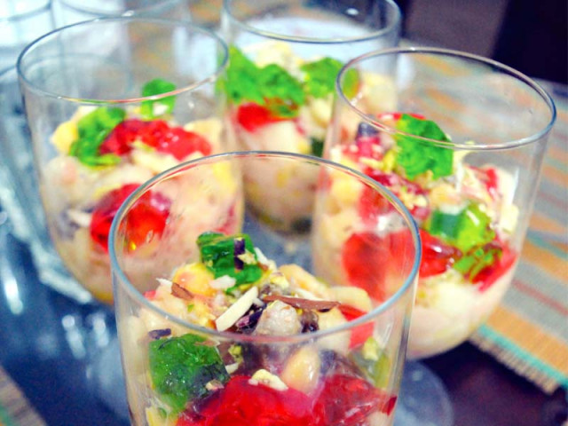 • Drop a spoonful or two of the fruit and cream mixture as the third layer, garnishing it with the crushed almonds, cashew nuts and walnuts. Serve chilled.