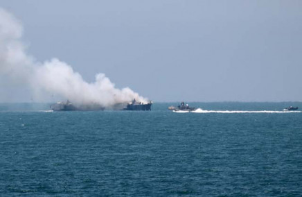Smokes rises from an Egyptian coastguard vessel on the coast of northern Sinai, as seen from the border of southern Gaza Strip with Egypt July 16, 2015. PHOTO: REUTERS