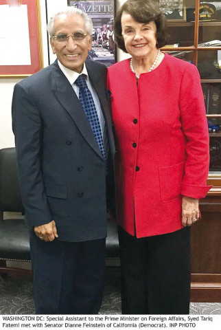 Special Assistant to PM on Foreign Affairs Tariq Fatemi and Senator Dianne Feinstein before their meeting. PHOTO: INP
