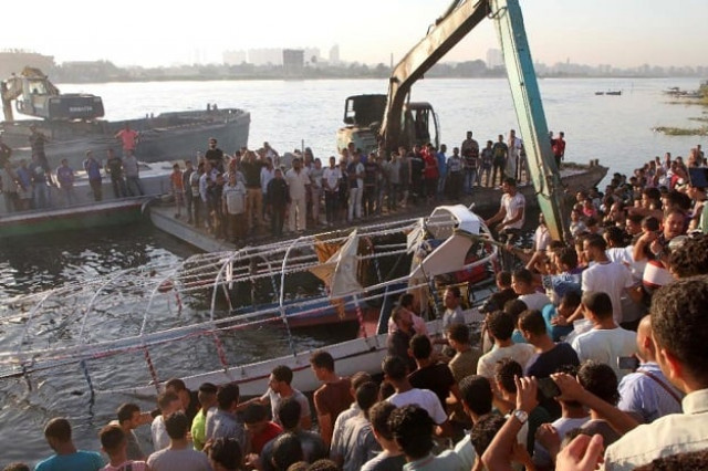 Relatives and onlookers gather on the bank of the Nile, north of the Egyptian capital Cairo, as the wreckage of a boat is pulled out of the water on July 23, 2015. PHOTO: AFP