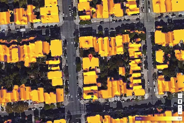 The Google image of your home appears in an array of colors ranging from purple to yellow, which indicate the amount of sunlight reaching the surface of the roof.