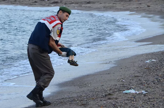 The body of the little boy could be seen lying face down in the sand near Bodrum, one of Turkey's prime tourist resorts, before he was picked up by a police officer in photographs taken by the Dogan news agency.