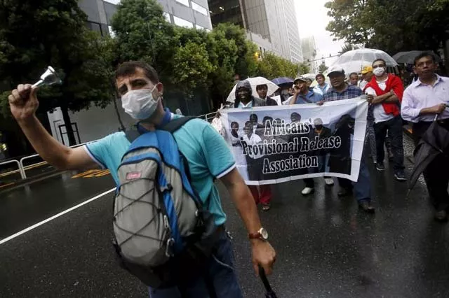 On Wednesday, around 100 foreigners on "provisional release" from immigration detention - many of them asylum seekers - marched through Tokyo's government district in the driving rain, calling for refugee visas.