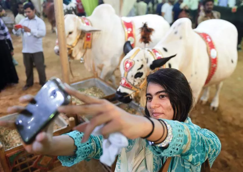 A young woman takes a selfie with animals at a cattle market set up for Eidul Azha in Karachi late on Thursday. PHOTO: AFP