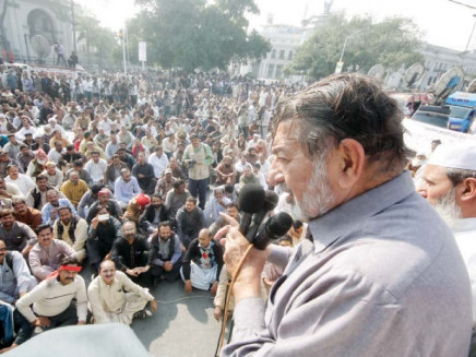Khurshid Ahmed addressing workers at Wednesday’s demonstration on The Mall, Lahore. PHOTO: ABID NAWAZ/EXPRESS