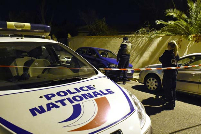 Police secure the near where a man was injured in a stabbing, on November 18, 2015 in the southern city of Marseille. A teacher at a Jewish school in the southern French city of Marseille was stabbed by three people shouting anti-Semitic obscenities and expressing support for the Islamic State group, local authorities said. The 57-year-old victim, who was wearing a kippa, was attacked outside his home, a short distance from the school and synagogue complex, a source close to the investigation said. PHOTO: AFP