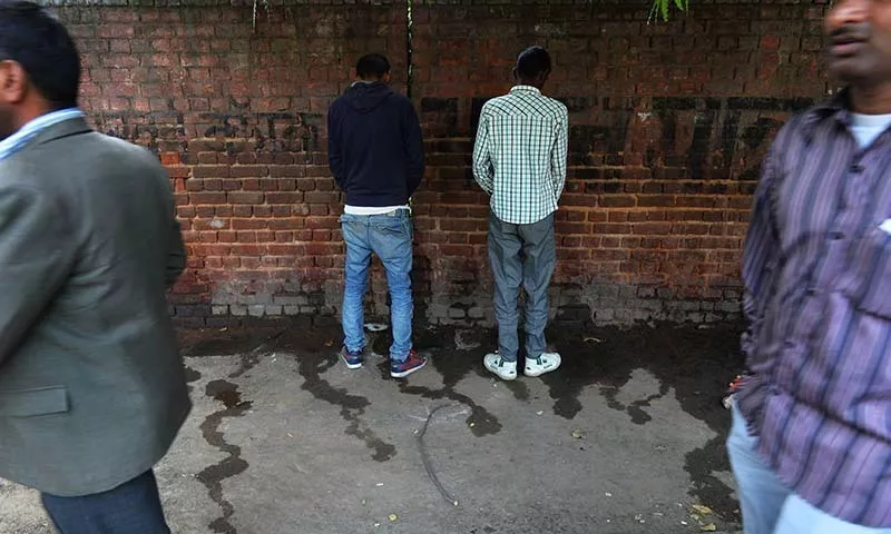 Indian men urinate on a wall at a roadside in New Delhi. PHOTO: AFP