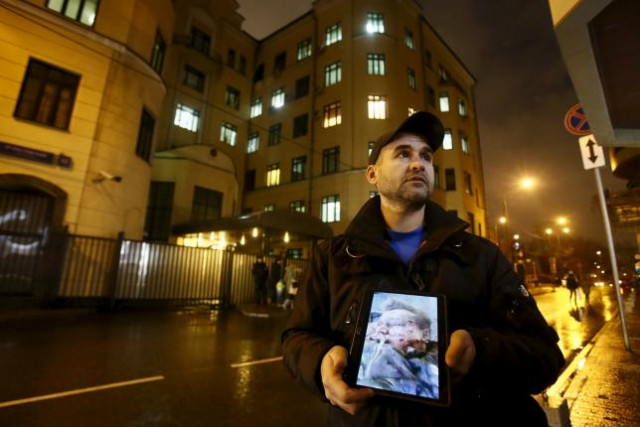 An activist holds a tablet with a picture of the lifeless body of a Russian pilot of a war plane shot down by Turkey, in front of the Turkish embassy in Moscow, Russia, November 24, 2015. PHOTO: REUTERS